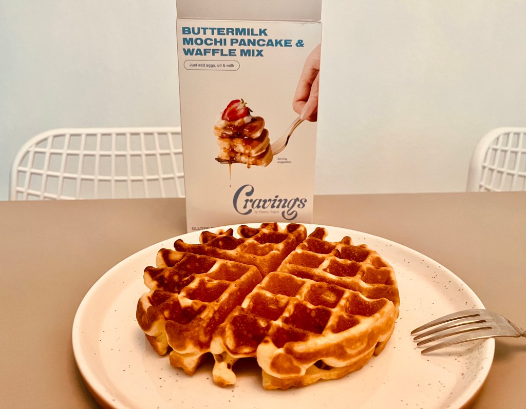 The result was pretty good: fluffy but reminiscent of rice flour baked goods, not too dry, buttermilk-flavored. I ate it with my usual waffle topping of fruity yogurt. The mix made 4 waffles total.