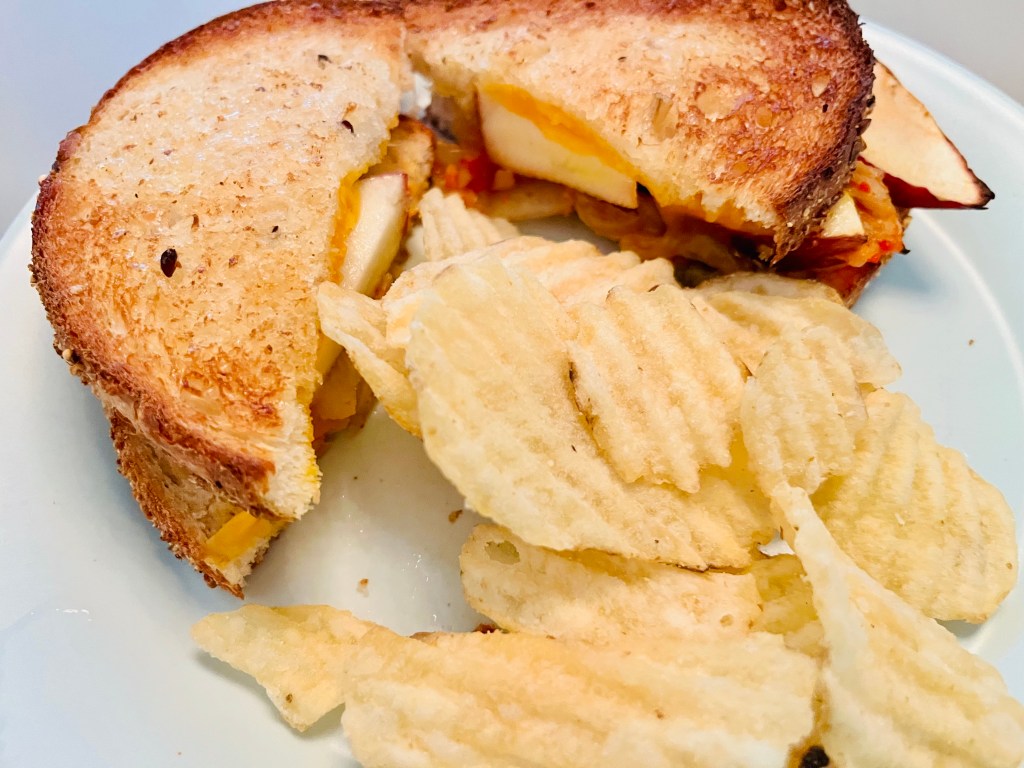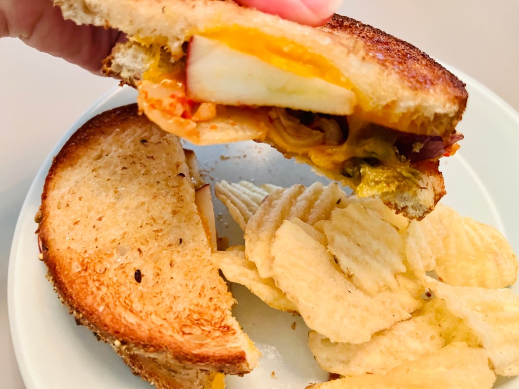 The possible fillings are endless. Apple slices and kimchi (pictured), leftover chicken, avocado, bacon, pear…anything that tastes good with cheese.