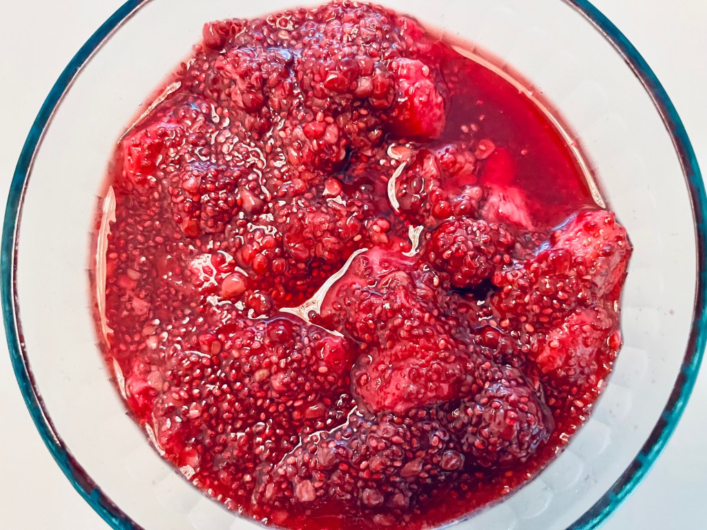 This one was a bit of an accident. I bought blackberries and when I got them home, I realized they were quickly turning to mush. So I put them in a pot with some strawberries, water, vanilla, and maple syrup. I was planning to make them into one of Amy Chaplin’s berry compotes. I noticed a recipe note in her book about adding chia seeds to make jam, so I did that: brought it to a boil, let it simmer for 5 minutes, and then took it off the heat and stirred in a quarter cup of chia seeds. It’s a little watery to be classified as jam, but I’ve already eaten it as a jammy overnight oats topping.
