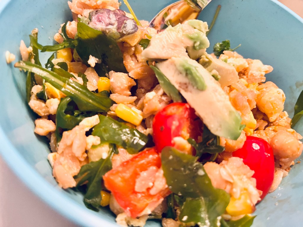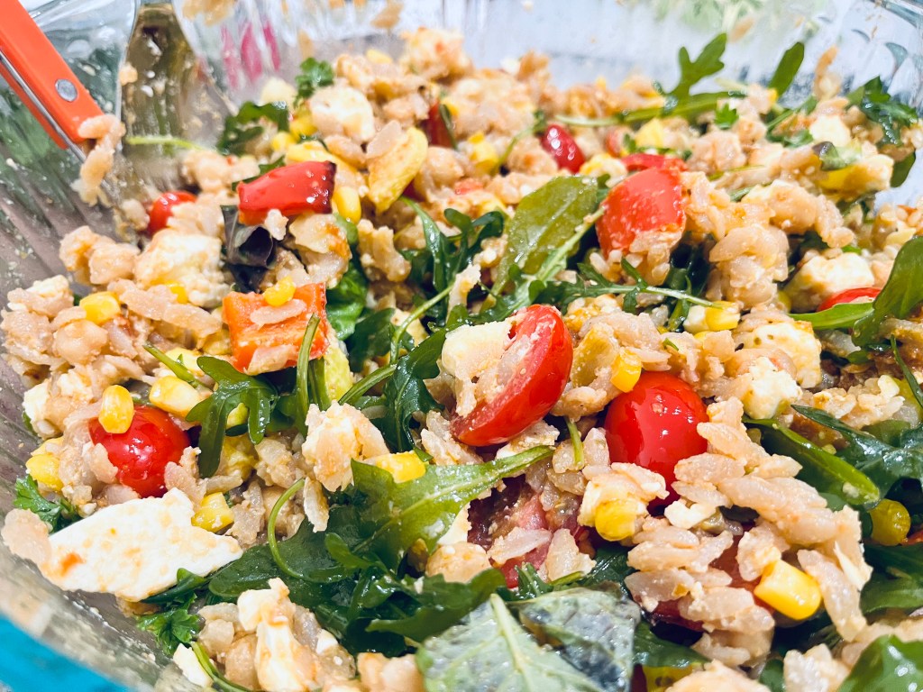 I found this recipe in Erin’s Well Plated cookbook and made some tweaks. The cookbook version includes roasted or grilled squash and corn, halved cherry tomatoes, arugula, orzo, chickpeas, feta, and basil pesto. I used less squash and added in a pepper, used store-bought sun-dried tomato pesto, and topped it with some parsley and avocado. The orzo (I used Jovial gluten-free cassava orzo) is a great blank canvas for a lot of different flavors.
