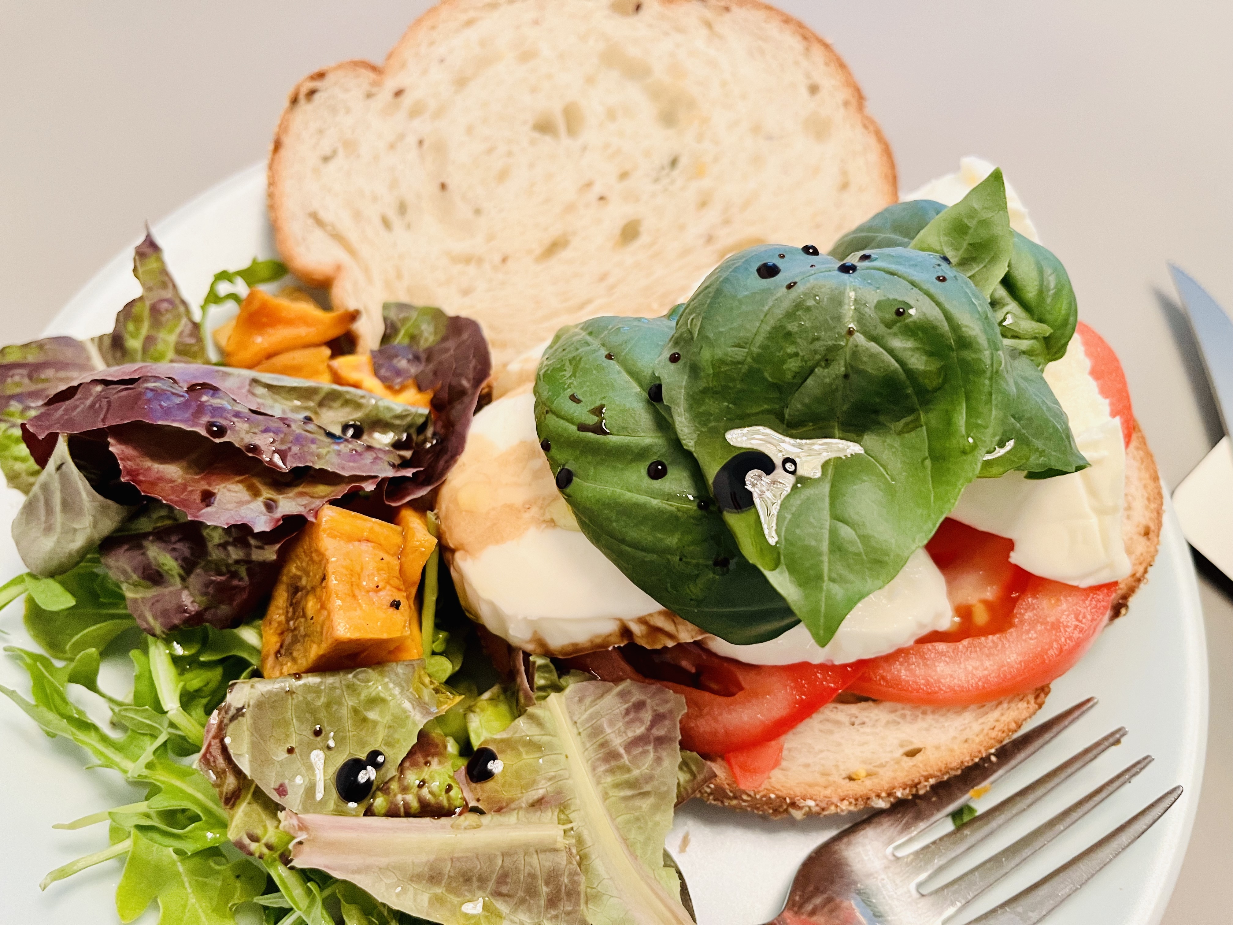- Caprese sandwich (mozzarella, basil, tomato) with balsamic vinegar and olive oil.